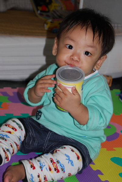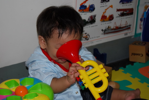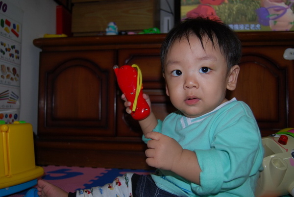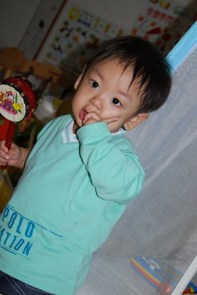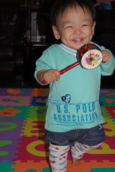 愛拿著鈴鼓跟鼓棒橫衝直撞 多怕一個不小心他被蹉到眼睛