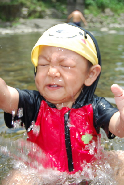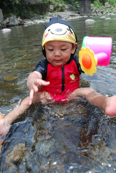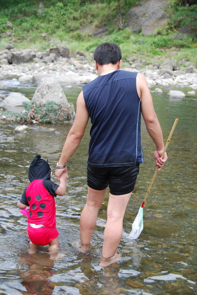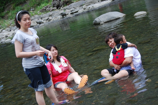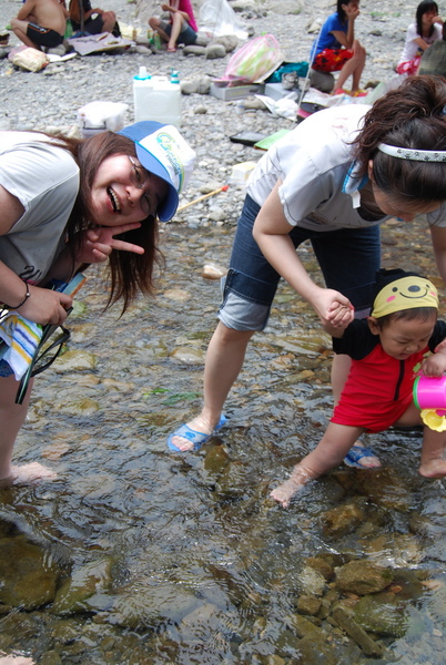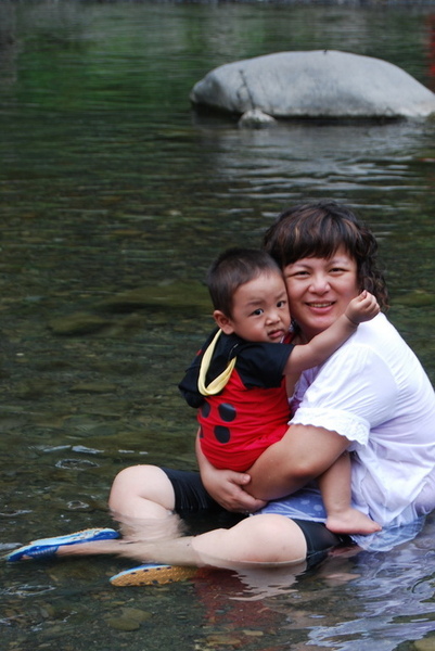 這位阿姨很奇怪喔 到溪邊來玩 穿運動襪慢跑鞋 是來順便洗鞋子的嗎?