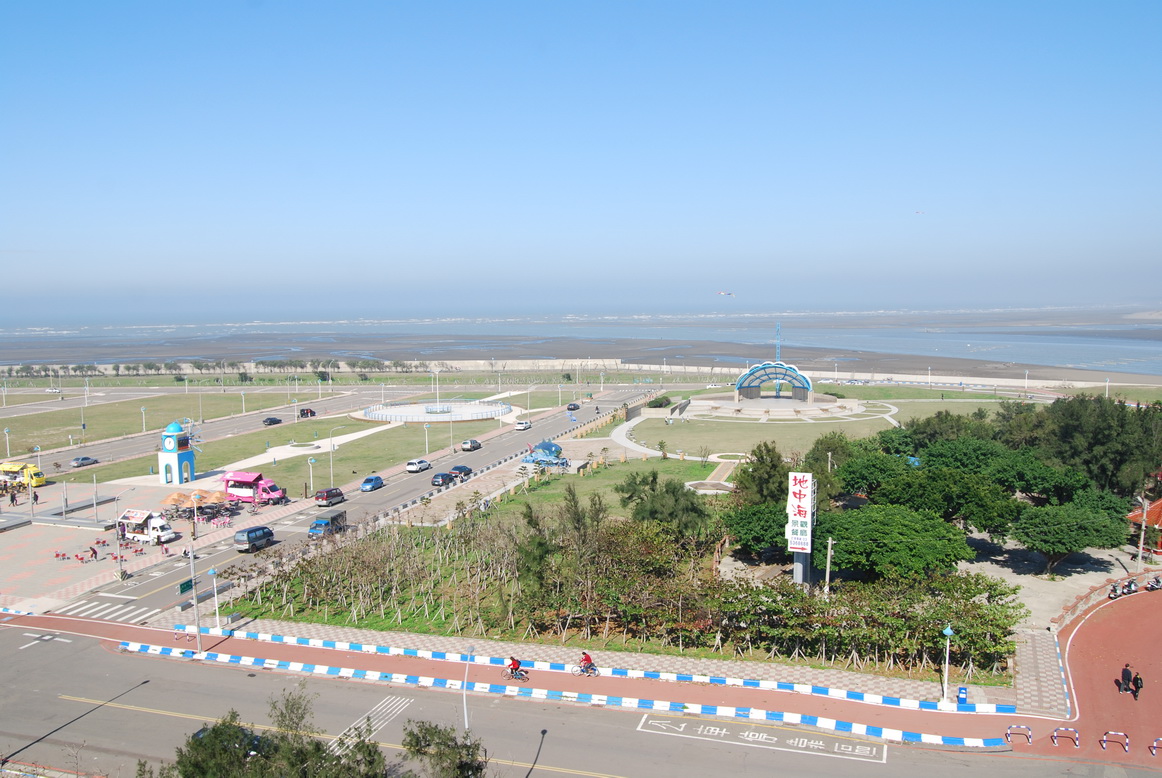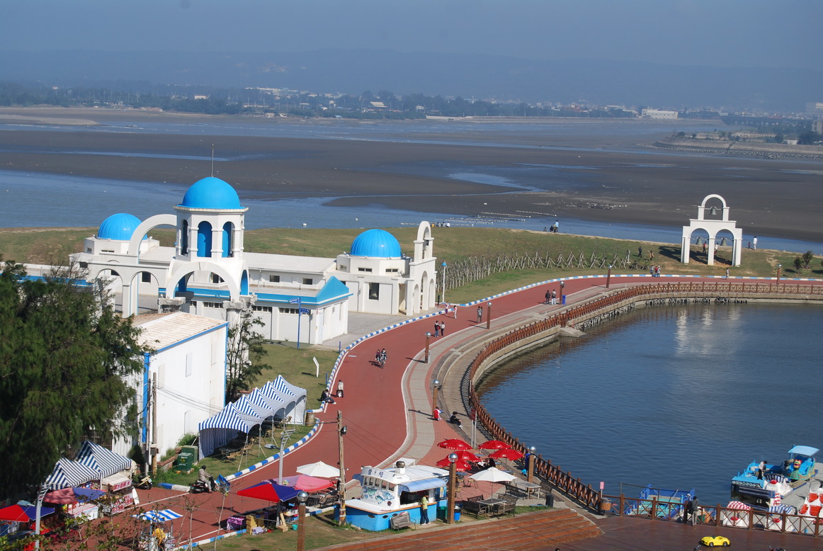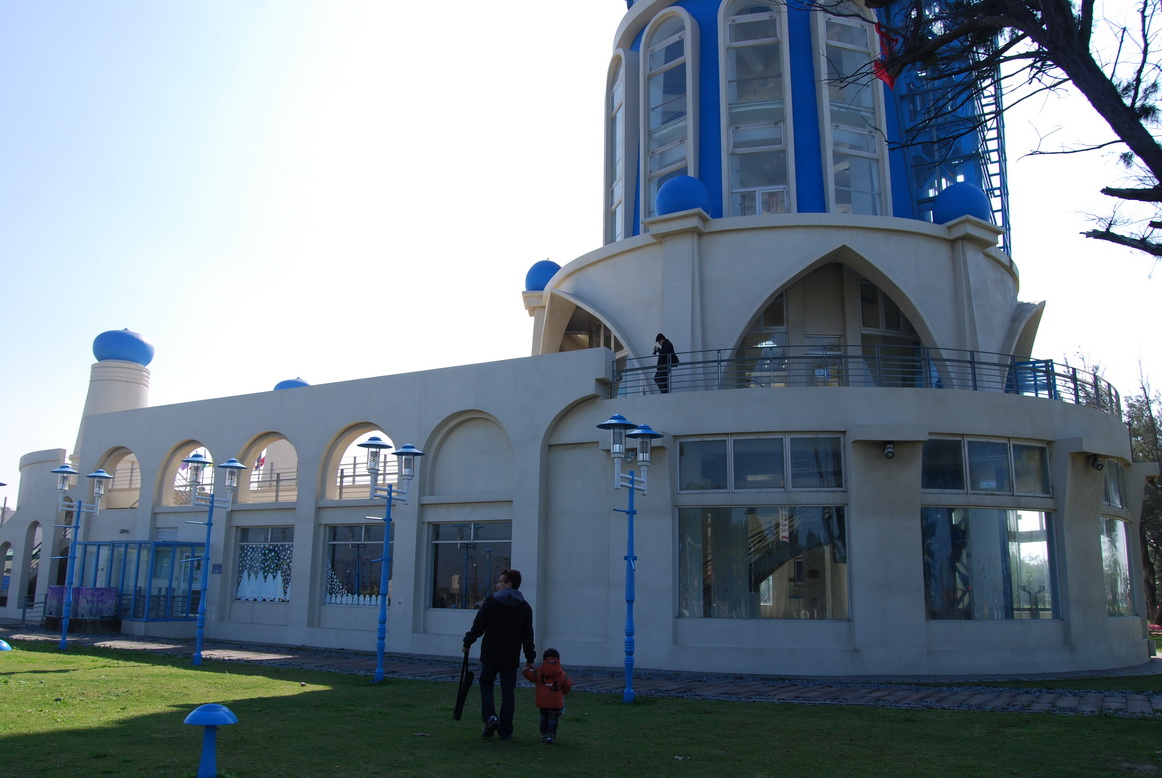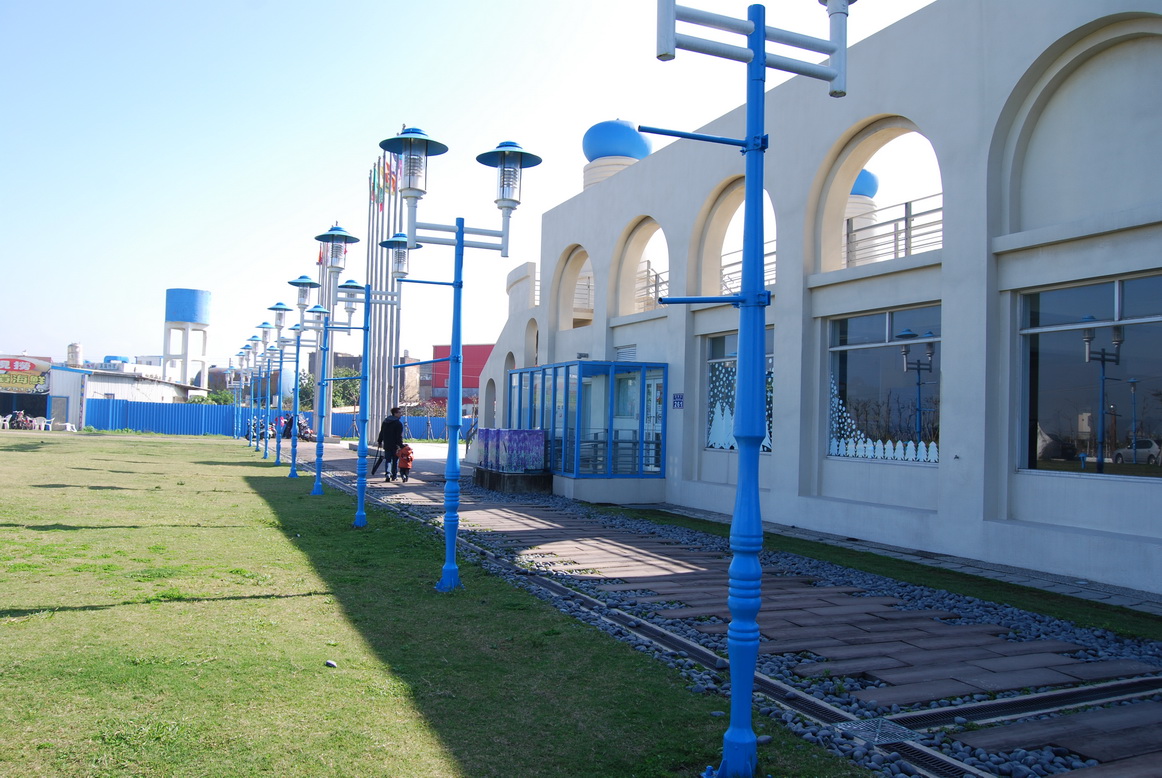 藍白相間的建築物 頗有地中海風 配上綠地與大海