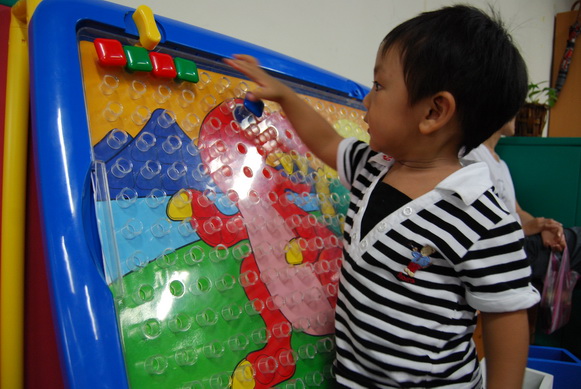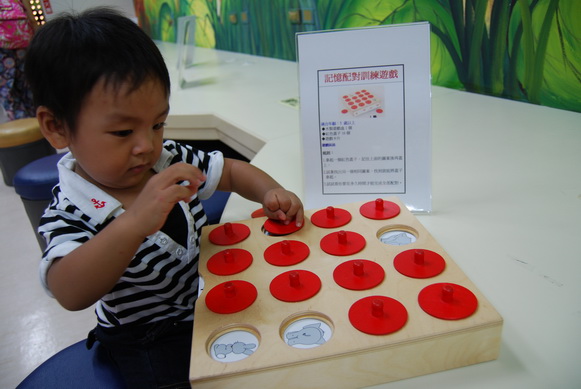 小朋友要從桶子裡面找出相同顏色跟形狀的棋子插到洞裡面去