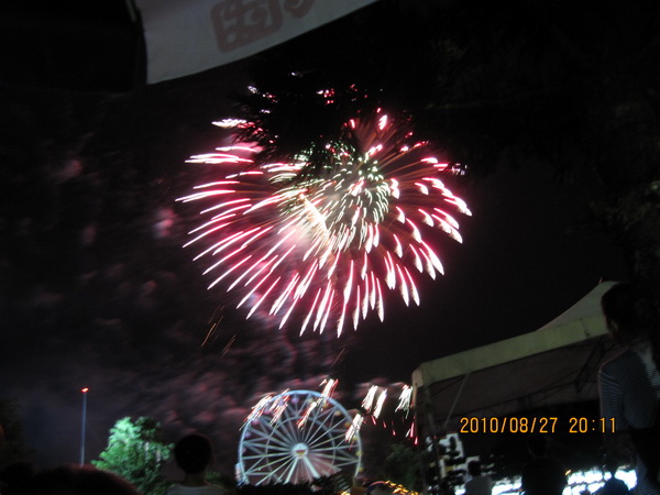八點十分 煙火終於開始放了 我們因為很害怕到時候要坐列車回大門口要排隊排很久