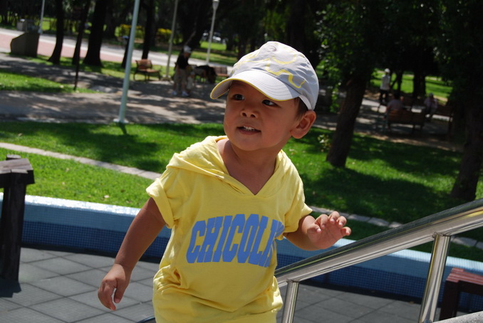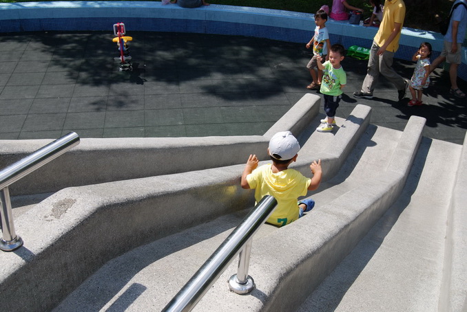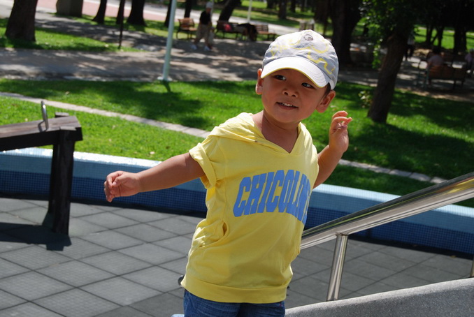大佟意思意思的溜了二三次溜滑梯 就被太陽曬的有點體力不支的說要走了