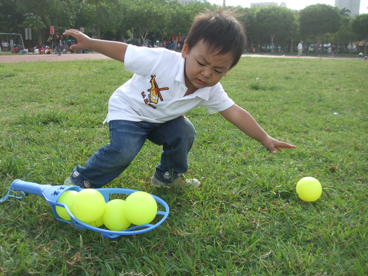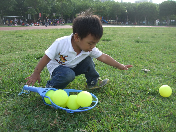 父子倆開始玩起用拍網裝滿球 看誰跑步不會掉出來的遊戲