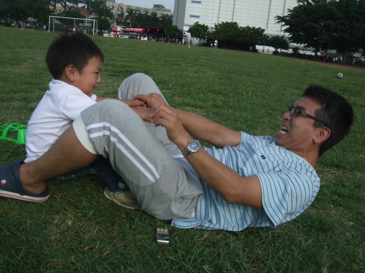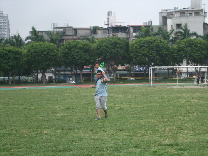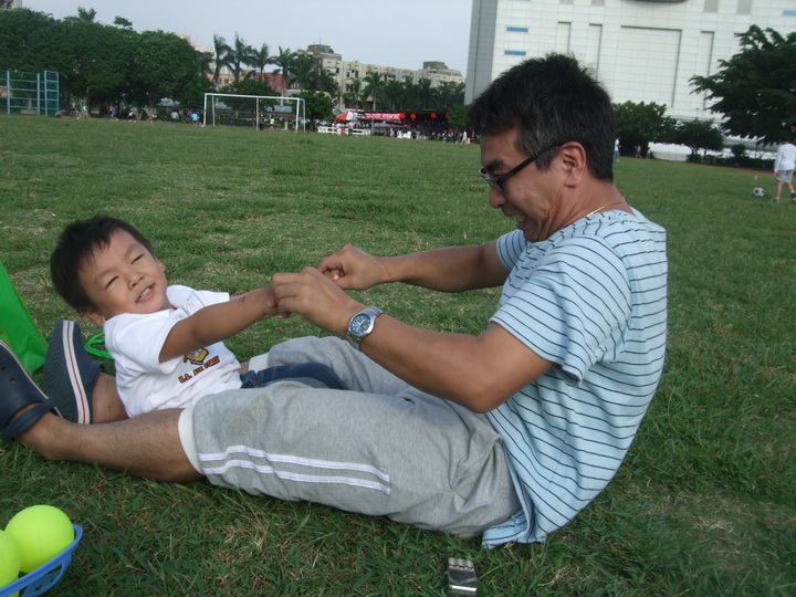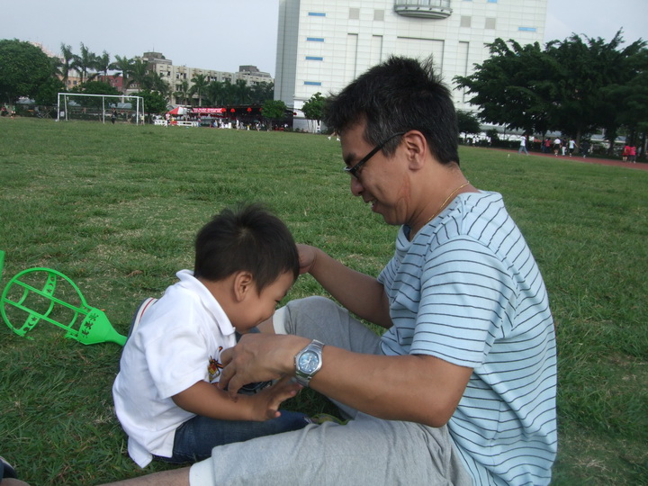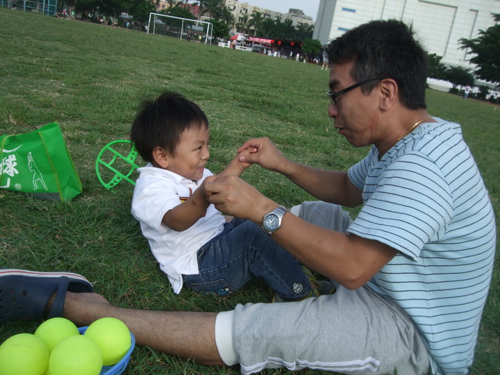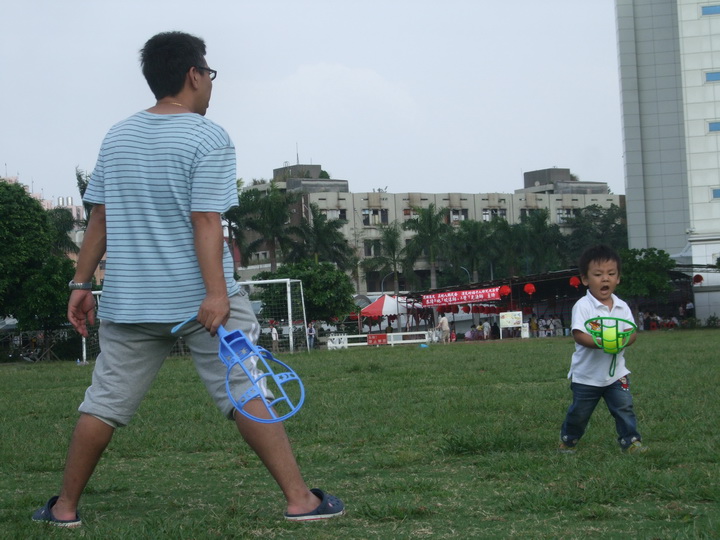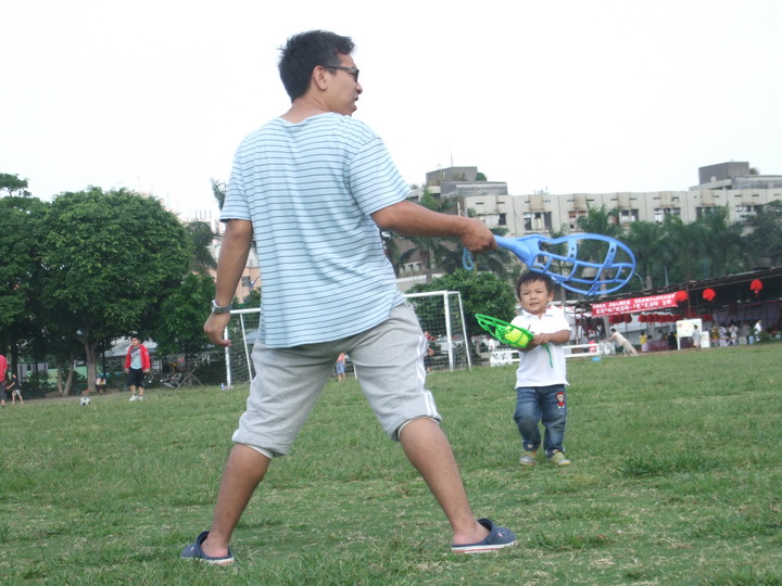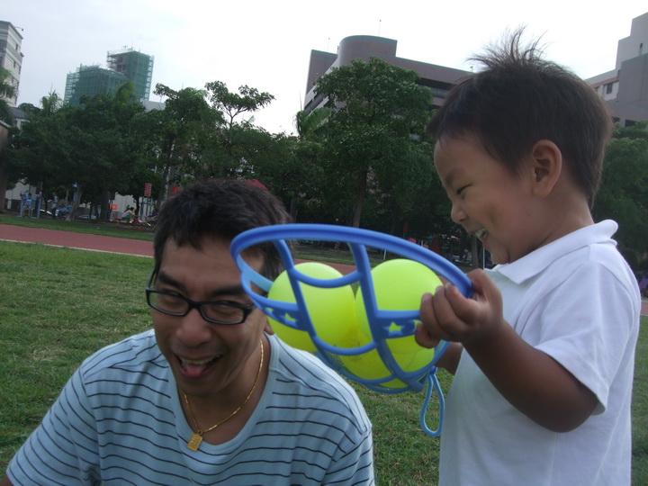 大佟只好乖乖的認命 自己拿起另外一隻拍子 跟老爸玩了起來