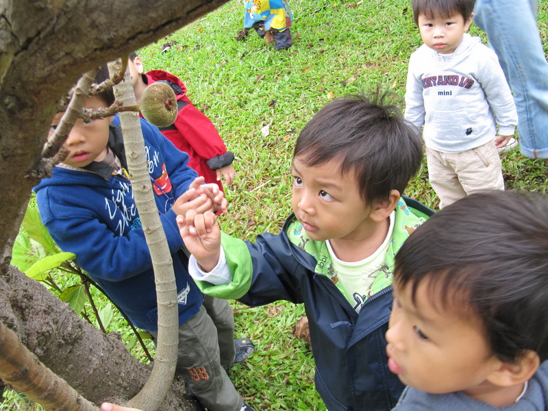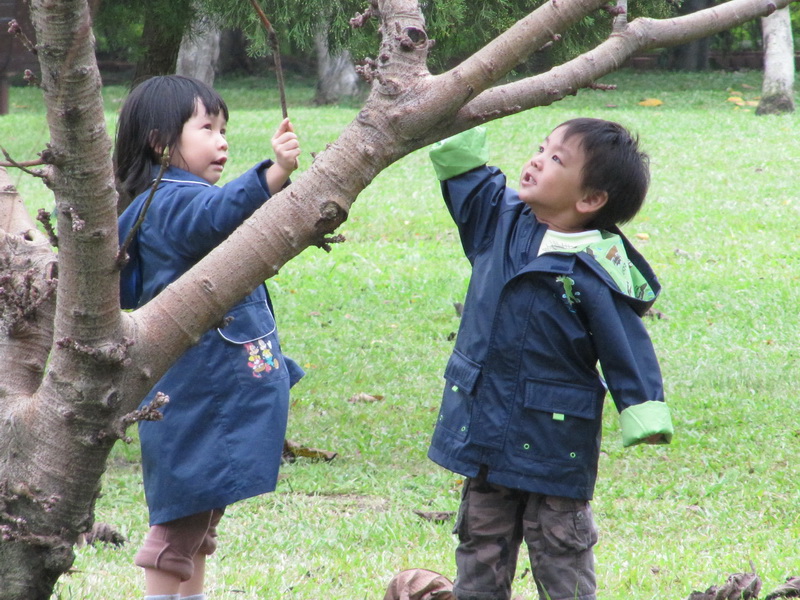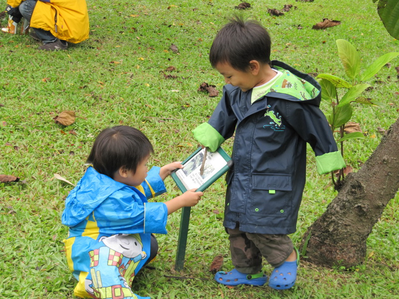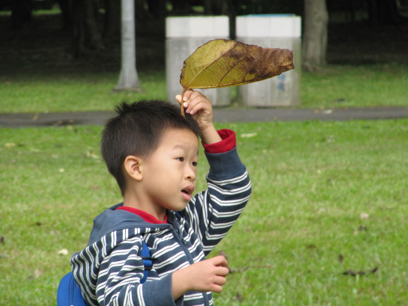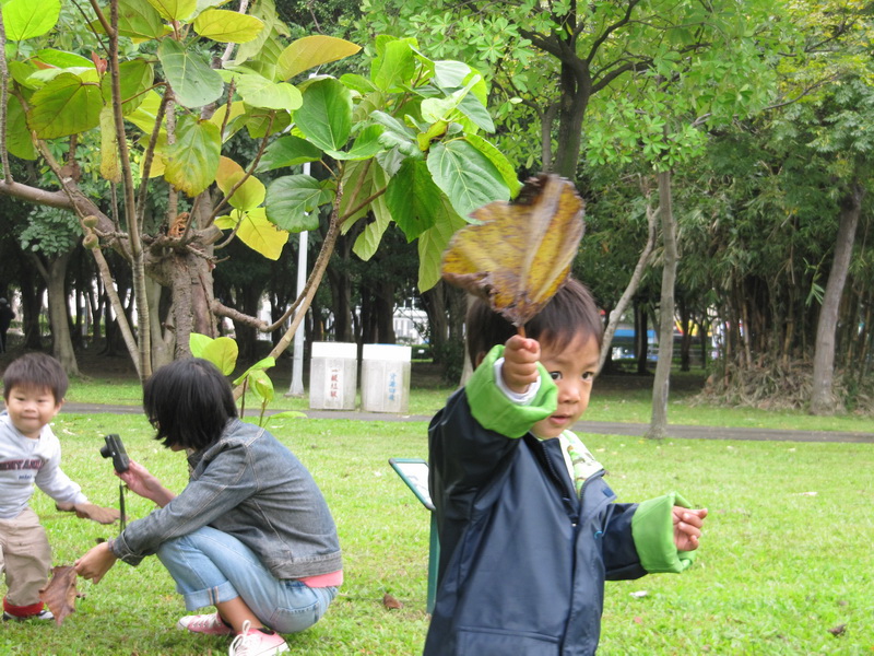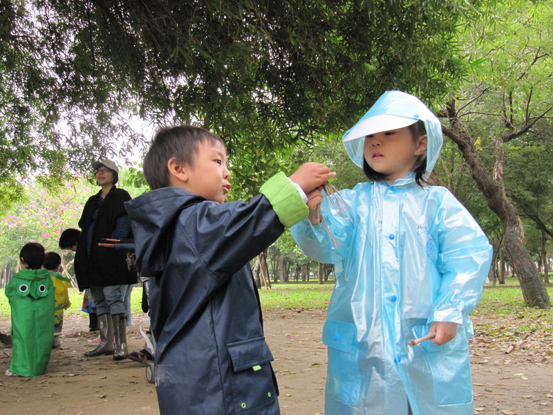 因為下著毛毛雨 小朋友們嘗試著用大片的葉子來當雨傘